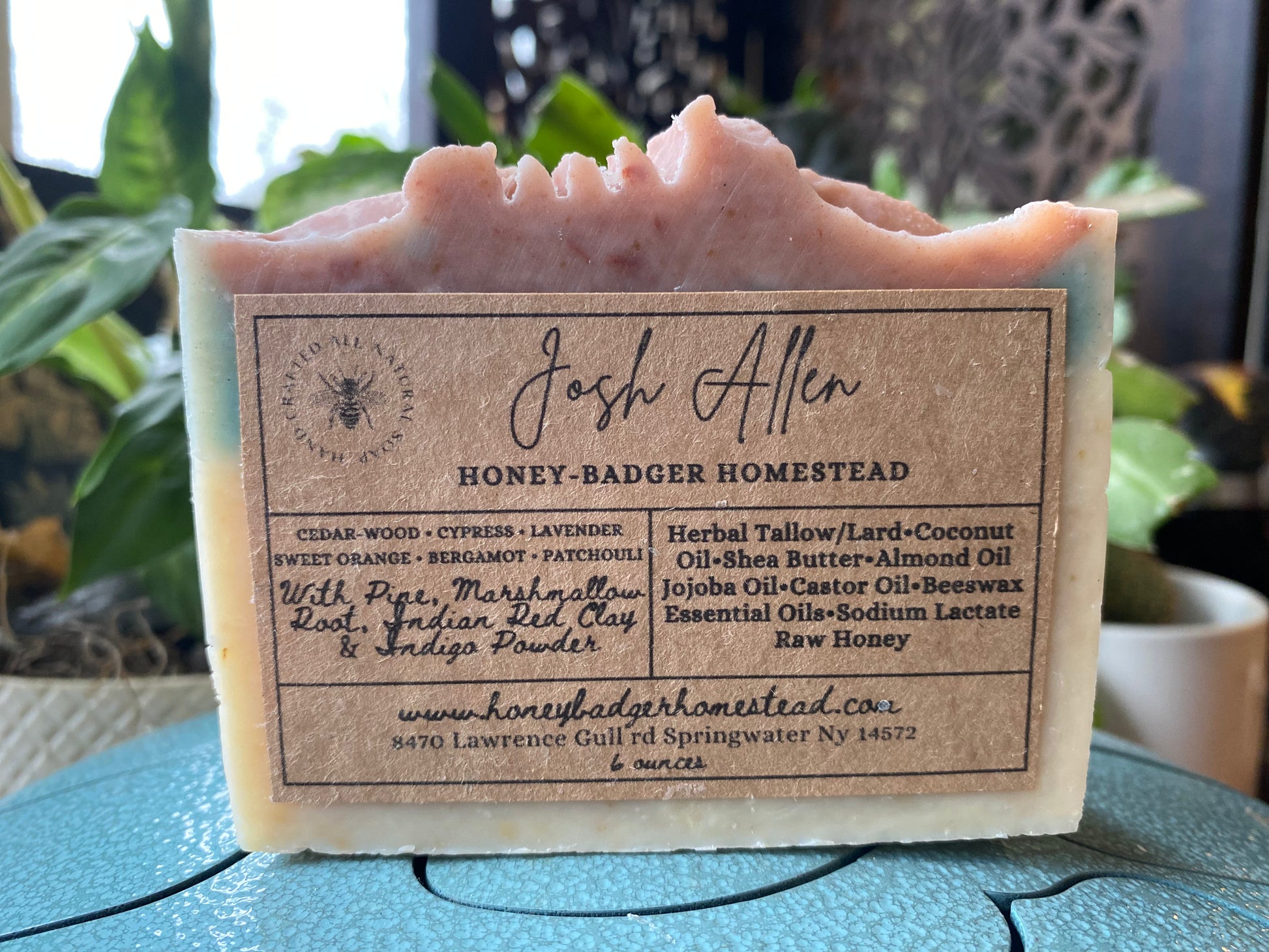 Naturally colored with pine, marshmallow root, Indian red clay, and indigo powder, each bar has its own character — no two are exactly alike, just like every big win.