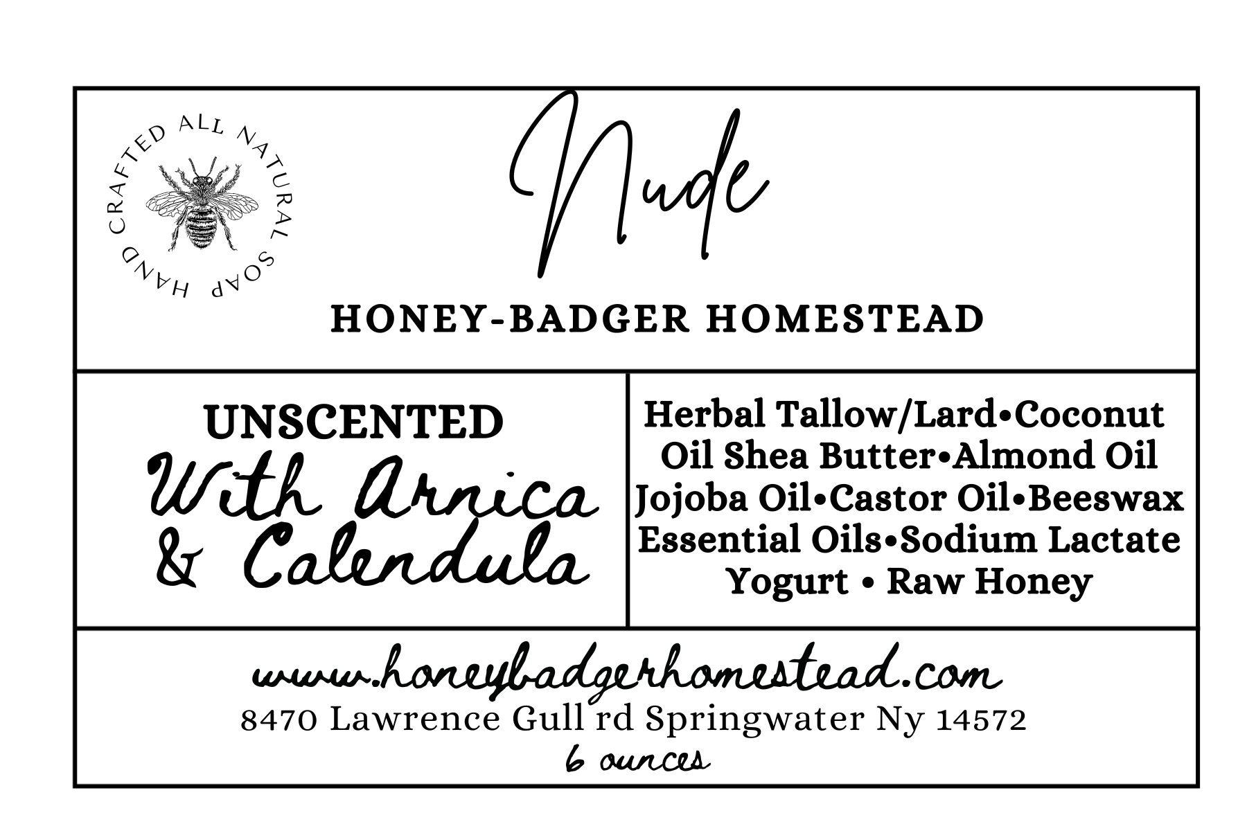 Our Nude bar is a stripped-down, skin-loving favorite. Crafted with our signature Honey-Badger Homestead recipe—rich tallow, beeswax, and raw honey from our own hives—this bar stays completely unscented and dye-free for even the most sensitive skin.