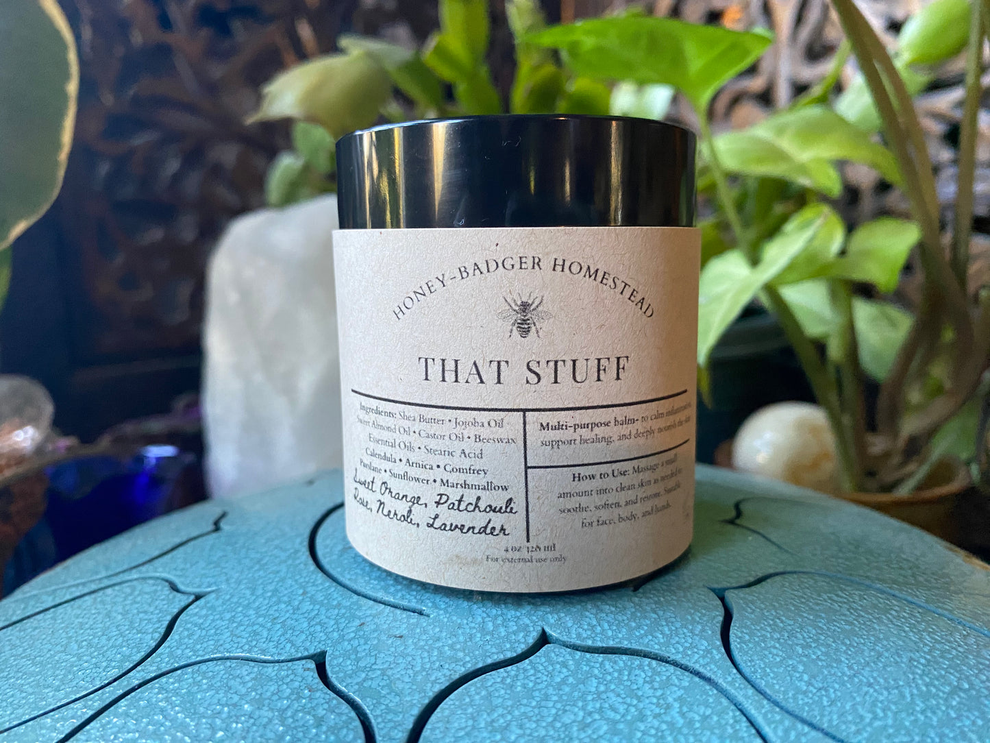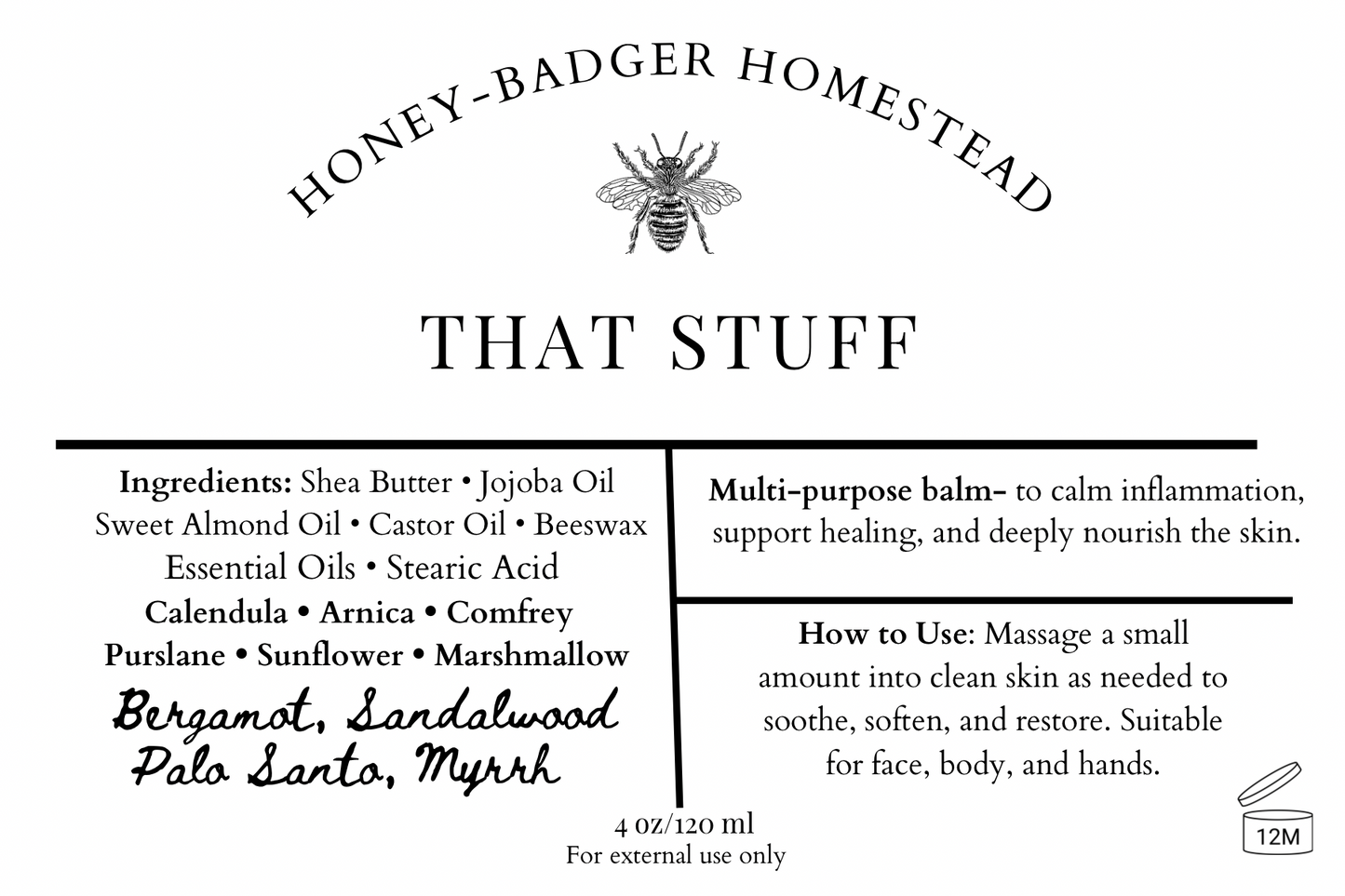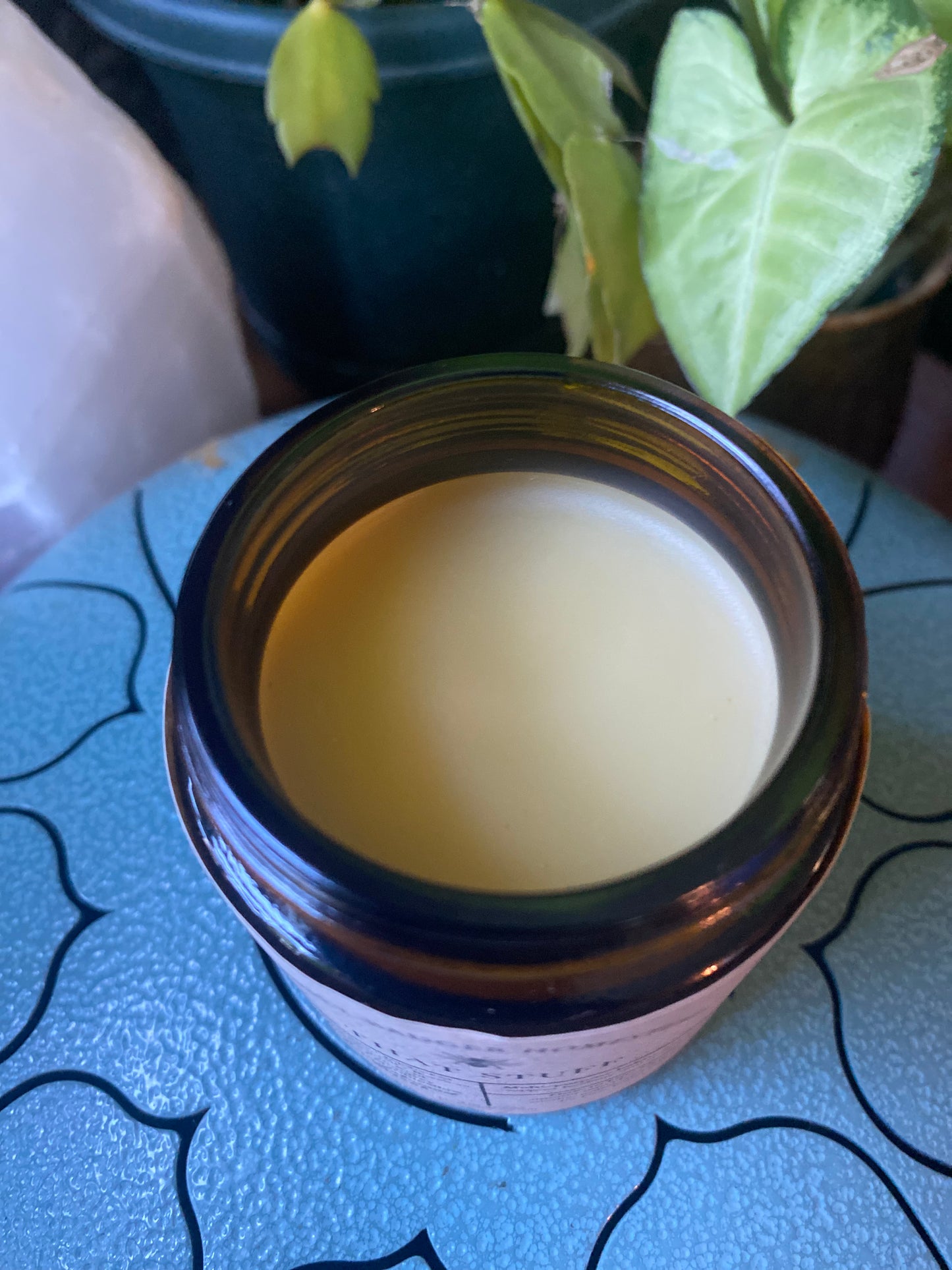A deeply nourishing balm formulated to soothe inflammation, support healing, and restore balance to dry or irritated skin. Crafted with shea butter, jojoba, sweet almond, castor oil, and beeswax—infused with a blend of medicinal herbs known for their skin-restorative properties: